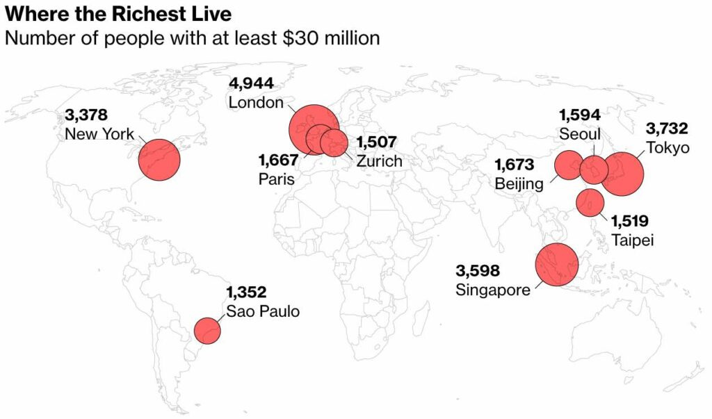 However, this should come as no surprise, as half of the top ten cities in the world with people who have at least $30 million are located in Asia. At the same time, London is home to the most people with over $30 million - by a wide margin.
