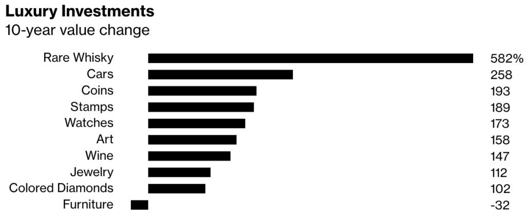 The ten year value change of rare whisky has exploded for an annualized return of over 58%, making many ‘whisky investors’ very happy.