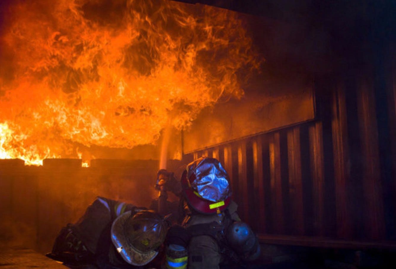 In the container that is elevated, a fire is ignited, while a bunch of firefighters sit in the container below.