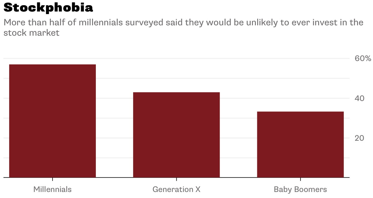 That’s why, “A whopping 57 percent of millennials surveyed said they would be unlikely to ever invest in the stock market, compared with 33 percent of boomers and 43 percent of Generation X.”