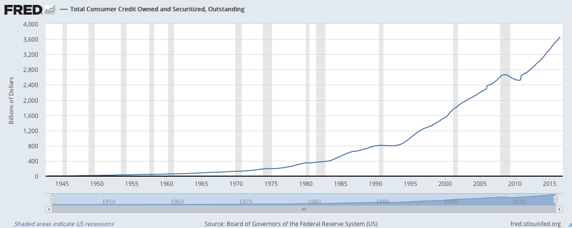 It’s heading up. Way up. People are borrowing more and more money to purchase all sorts of things. You might be thinking, “Great, the economy is working!” In reality, all this means is that money is easier to borrow for cheaper prices, so people can buy more expensive stuff. This is obviously not an economic policy that has a long life.