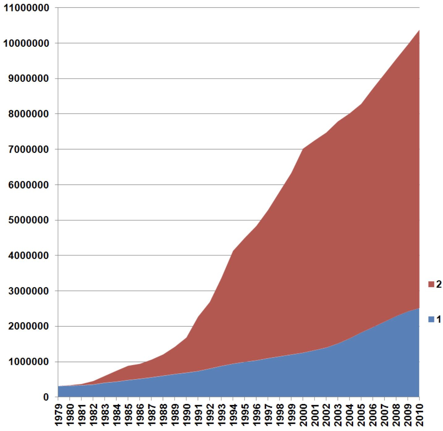 Nowhere else in the world is this more apparent than in Shenzhen, China. In the below graphic, we can see population growth of Shenzhen. The blue represents the population with permanent registration, while the red represents the population with non-permanent registration.