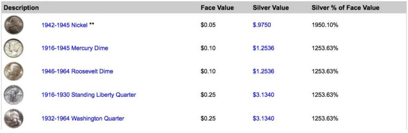 For example, if you own a 1943 nickel, it’s melt-value today is worth nearly $1. That means if you literally melted the coin and extracted the silver, it’d be worth about $1 even though the nickel’s face value is worth 1/20th of that.