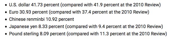 If we take a look at the recent change to the IMF’s basket of currencies, we’ll see that the British pound and the euro each dropped the most, relative to their original weighting in the basket.