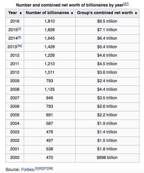 I took this from Wikipedia, which combined the information from “The World’s Billionaires” list published by Forbes. On this list, we can see that there are only several times where the total number of billionaires AND their total combined net worth declined. There are three periods of decline, starting from the year 2000. The first begins in 2002, after the dot-com bubble. The second begins in 2009, after the housing bubble (or Great Financial Crisis). The third begins in 2016, which doesn’t really correlate to anything… yet.