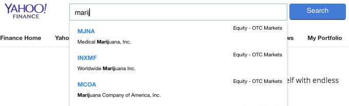 I’m going to show you what happens when you type in “marijuana” on the world’s most popular stock analyzer - Yahoo! finance: