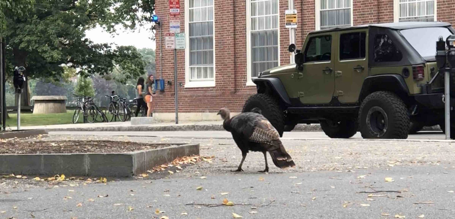 Geese walked across huge lawns, turkeys strolled down sidewalks, and college students were everywhere enjoying one of the last warm mornings for the year.