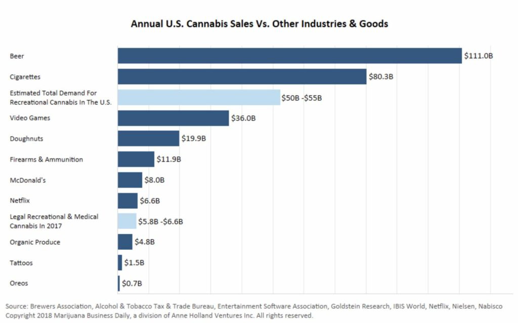 Cannabis sales are set to surpass NFL revenue by 2020, and is on track to break $100 billion by 2023. -NY Post