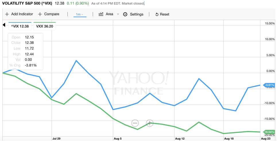 I’ve got to admit… I don’t really want to share this with you. It’s not because I’m embarrassed… it’s because I’m frustrated! Just talking about this makes my blood pressure rise. Have you ever been told you’re wrong, even though you know you’re right? For example… Say you were driving down the road at 50 mph (km/h for you non-Americans) and then the police pull you over. The officer walks up to your window and says, “I just clocked you at 90 mph! That’s well over the speed limit.” Meanwhile, you’re thinking to yourself, “I know for a fact that I was not going 90 mph… I was going 50!” Then, you argue with the police officer and he ends up giving you a speeding ticket. You drive away thinking that you’re either going nuts or you just got bamboozled by the police officer. Basically, you know you are right, but someone else says you’re wrong. And you pay for it. Ok… here is where I made my mistake… I made a trade on the VIX - the volatility index. I looked at the historical average of where the index was during the month of August and I also looked at current events to gauge where the index was headed. I placed a trade that I basically knew would fall in my favor. But I was wrong. At first, I thought I was going crazy because I didn’t understand where I made the huge mistake. (it wasn’t that huge, as the trade was small in dollar amount… but it still pissed me off!) So, I started to do some research to see where I went wrong… and then I came across an article that you can check out here. **Warning… this is super technical material, so if you don’t want to be bored or confused, just skip down to the last couple sentences.*** The only way to trade the VIX is by using ETFs, as the VIX is only an index. The ticker symbol “VXX” is the post popular trade… and that is what I was using. So, I made the trade that I felt was going to be a for sure win… and then I was wrong. Take a look at this chart:
