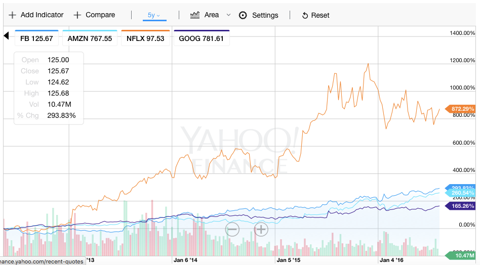 Here are the past 5 years of FANG stocks. Facebook (up 294%), Amazon (up 260%), Netflix (up 872%), Google (up 165%) stocks gains: