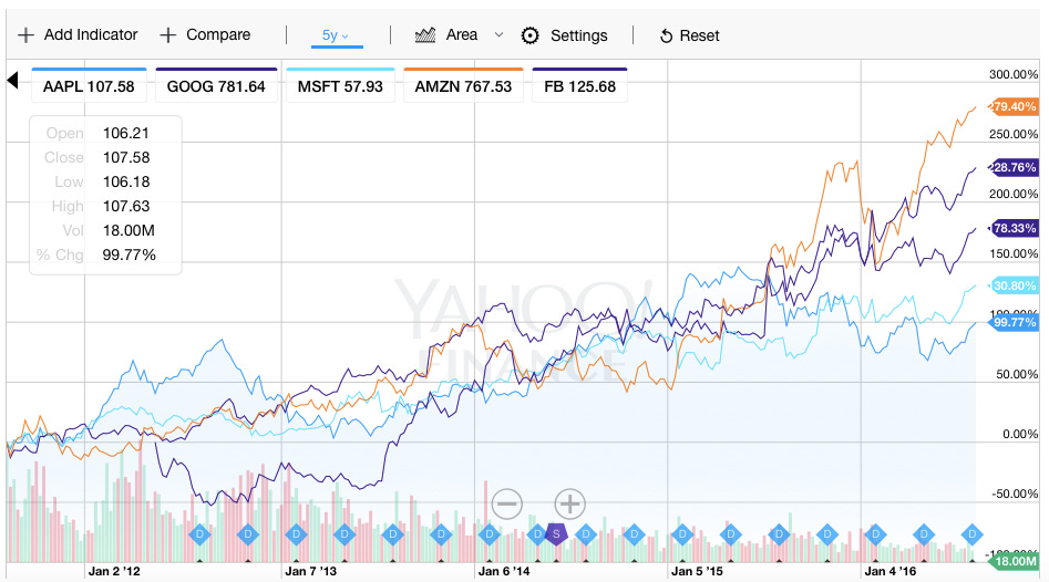 Here is the past 5 years current top 5 market cap leaders. Apple (up 100%), Google (up 78%), Microsoft (30%), Amazon (up 280%), Facebook (up 229%) gains: