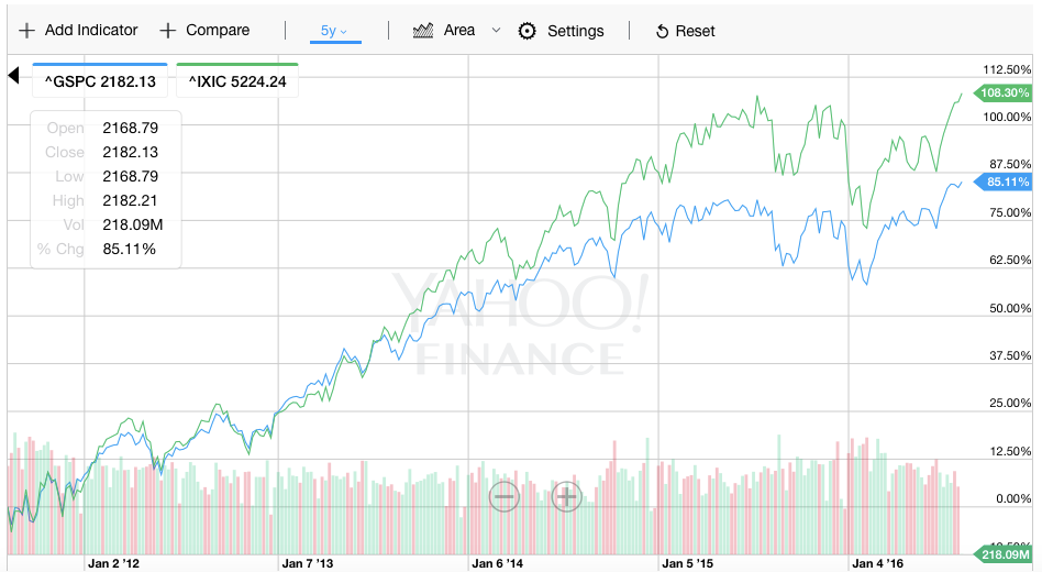 Here are the past 5 years of the S&P 500 and NASDAQ. They are up 85% and 108%, respectively: