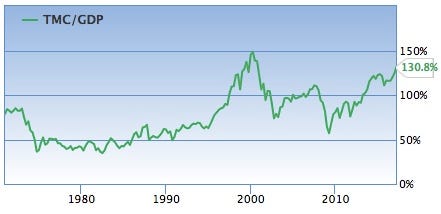 In recent times, this ratio of market cap compared to GDP has only been higher during the 2000 dot com bubble.