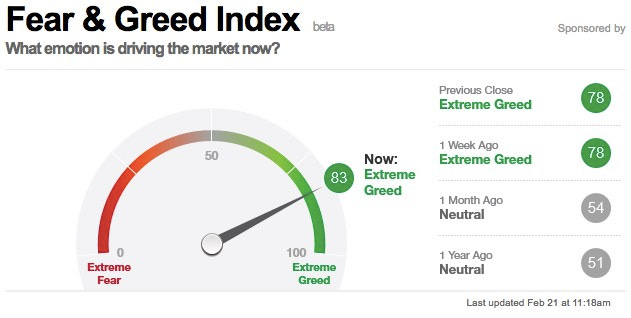 I want to be clear. I am not predicting a market crash tomorrow. In fact, there is a lot of evidence that would suggest our economy (and stock market) could see an enormous bull run in the coming years. The simple fact that there are cautious investors (like myself) suggests that the overall market has not reached “irrational exuberance.” This was clear in 2000 and 2007 when everyone (and their mom) was jumping into stocks or real estate. I don’t hear people talking about the stock market in the grocery store. There are no signs of imminent doom. There are, however, a variety of indicators that are telling me I should be keeping an eye on the exits. In no particular order, here are several indicators that have caught my eye: The Fear and Greed Index (provided by CNN Money) has some interesting data points that indicate a market getting relatively hot.
