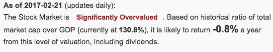 Goldman Sachs analysts have stated, “Cognitive dissonance exists in the US stock market. S&P 500 is up 10 percent since the election despite negative [earnings per share]…” This is evident in Warren Buffett’s favorite indicator where we can compare total market capitalization to GDP. Or in other words, how much are things being valued at, compared to how much they’re actually making?
