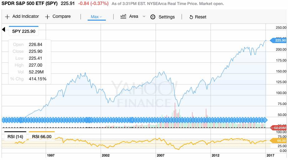 Let’s look at the historical chart of the S&P 500 ETF ($SPY). This stock basically tracks the S&P 500. Now, look at the yellow line at the bottom of the chart. When the line moves too high or too low, it is signaling a move that is out of the ordinary relative to its normal strength.