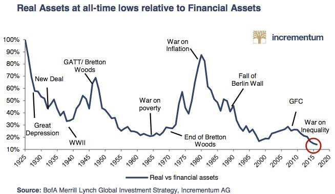 We can invest based on odds, probabilities, and chances… or we can make it much easier: Buy low, sell high. Sounds simple, right? Well… there are two problems with this strategy: #1 It’s extremely difficult to invest in things that others are avoiding. If you are buying things that others are selling, and selling things others are buying, then you feel as if you are not part of the group. #2 Hindsight is 20/20. Often times we only know when things are high or low after the fact. But, here’s the thing… even though it’s tough to go against the crowd, we can still do it. And yes, hindsight may be 20/20, but there are some obvious market highs and lows we can see right now. For example, we know that real assets are at all-time lows compared to financial assets.