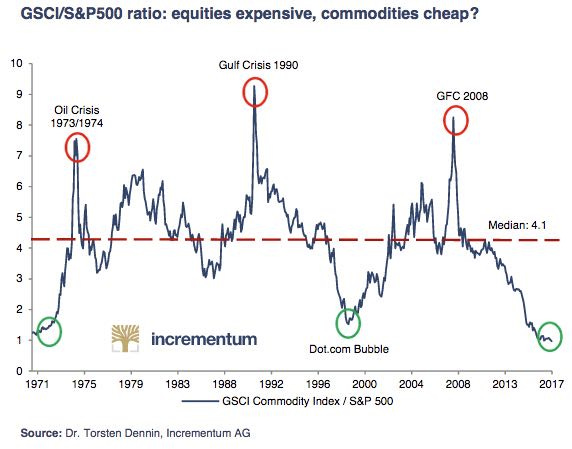 “In a historical context, the relative valuation of commodities to equities seems extremely low. In relation to the S&P 500, the GSCI (Goldman Sachs Commodity Index) is currently trading at the lowest level in 50 years. Also, the ratio sits significantly below the long-term median of 4.1. Following the notion of mean reversion, we should be seeing attractive investment opportunities.” - Incrementum