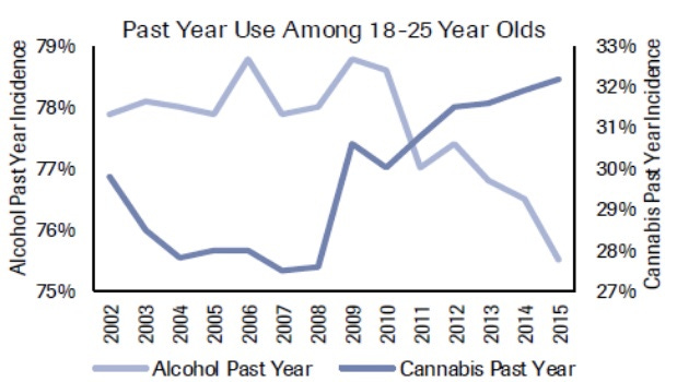 Last week Goldman Sachs downgraded Boston Beer Company and Constellation Brands because millennials consume more wine than previous generations. And it’s not just wine that’s putting pressure on beer. It’s cannabis. Researchers have found that millennials are actually moving away from alcohol all together. Instead, their vice is marijuana.