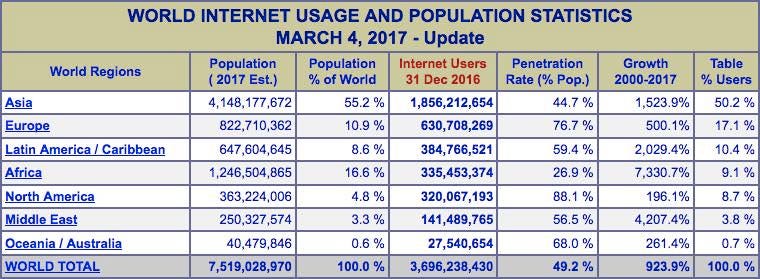 The Most Obvious Investment Of The 21st Century… that’s quite a statement. Honestly, if I read that headline I’d think something to myself like, “Yeah, right…” But, stick with me here, because I’m going to show you exactly why this is the best investment right now. I can’t think of anything that will be better in this century than this one obvious investment. Let me give you a little background first. I am on the phone for at least an hour a day talking with one (or more) of the many companies I have invested in. Sometimes I am just getting an update to see where they are at, in terms of progress. Sometimes I am learning about their different challenges and achievements. And sometimes I am trying to help the company get over some hurdles. The last two days have been more of that last sentence - getting two separate companies over some huge hurdles. Honestly, it hasn’t been fun. It’s been hours of phone calls with emotions flying and feelings getting hurt. The reality is that operating a business, managing investments, and making money is stressful. Lost profits, lost investments, and lost money can start to get very scary. Here is something that is interesting… Both of these companies that I am helping (and invested in) really have nothing to do with each other. They are in totally different industries. One is a physical product (tangible) and the other is a digital product (non-tangible). But, the solution to both of their problems is EXACTLY the same. Here is “The Most Obvious Investment Of The 21st Century": utilize the internet better. That’s it. It’s so obvious and simple that it sounds dumb. The internet allows you to sell to the world, not just the street where you’re located. You can sell anything, anywhere. That’s a crazy concept. Shockingly, very few companies have adapted. They are still stuck in the ‘hometown mindset.’ In addition to sending you investing ideas and strategies… I also try to give you money making ideas (really that's the best kind of investment). With that in mind, I encourage you to start thinking about how you can further migrate your business to be more online friendly. Don’t have a business? No problem. Make yourself more online friendly. Start exploring ways that will make you more successful online. (I will have A LOT more about this in the future, but I just want to get you thinking on this.) Until then, check out these statistics about internet usage throughout the world.
