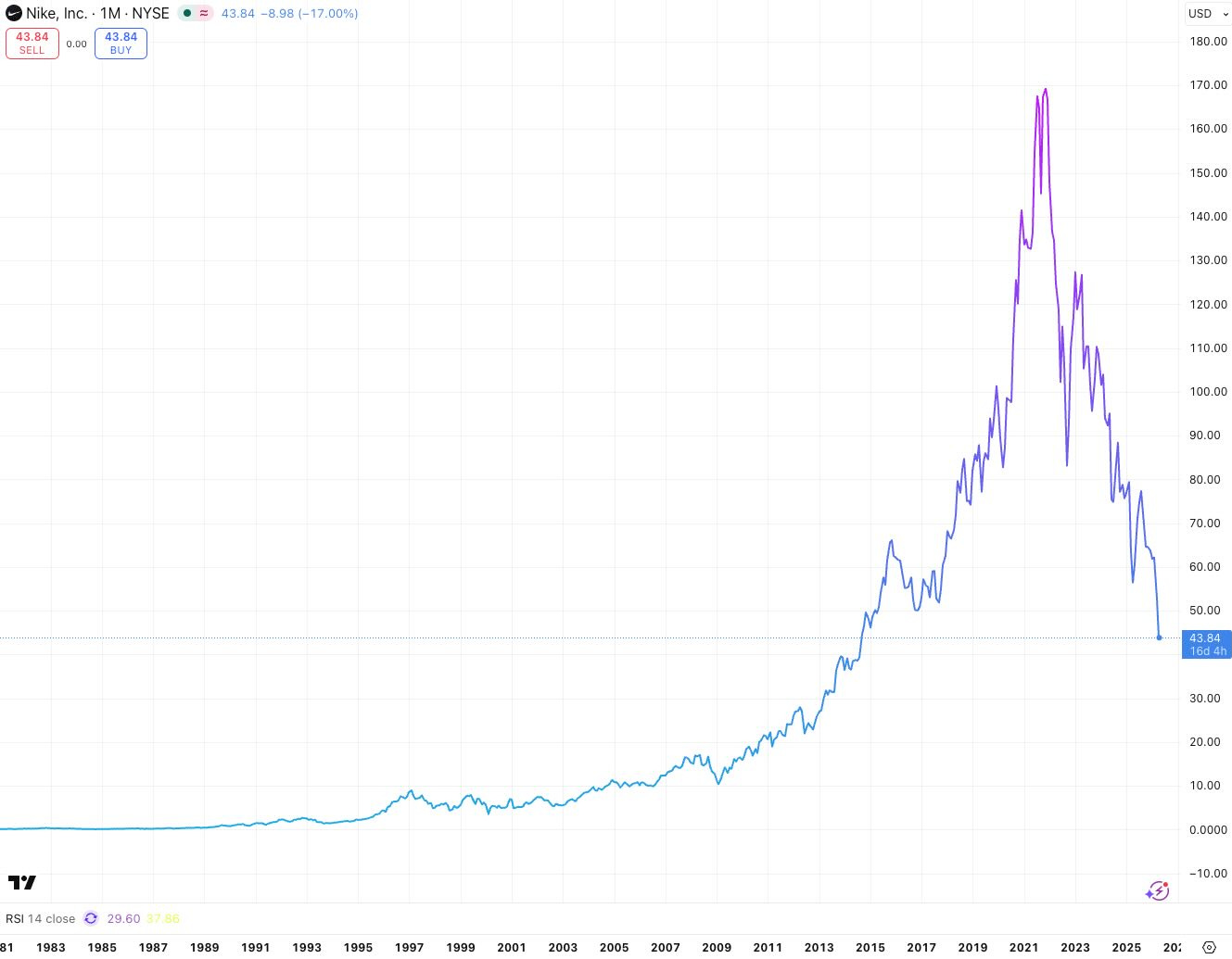 One the best examples right now is Nike ( NKE 0.00%↑ ) . The company seems to have done everything wrong over the past several years, which has sent share prices plummeting to levels not seen since 2014.