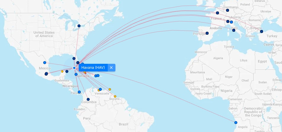 Havana is the busiest airport and has international flights that go to the US, Mexico, Canada, Panama, Colombia, Venezuela, Germany, France, Italy, Spain, Turkey, Cayman Islands, Guyana, and Angola(!).